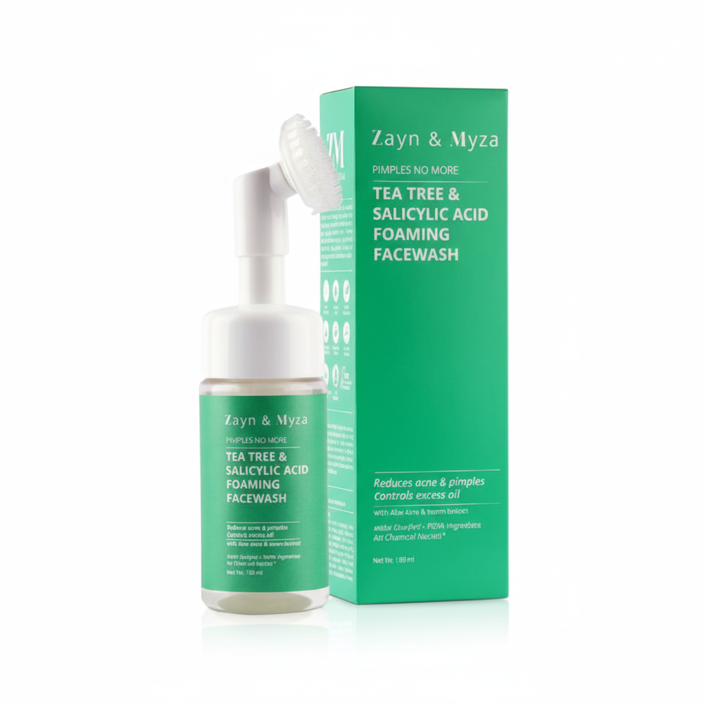 The Zayn & Myza Tea Tree & Salicylic Acid Foaming Facewash is designed to be a simple solution for pimples. This foaming face wash is infused with Tea Tree and Salicylic Acid, which are known for their ability to combat acne and control excess oil. It comes with an integrated brush to provide a deep cleansing action that removes impurities and unclogs pores, leaving your skin feeling clean and refreshed.